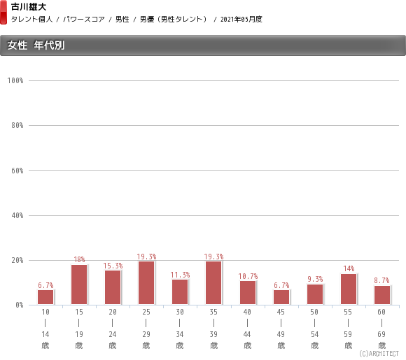 最新の2021年5月度のタレントパワーを見ると、男性は6.2%、女性は12.7%と女性からの支持が2倍以上も高い。