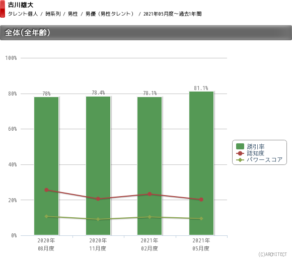 タレントパワーランキングの調査によると、古川の認知度は2020年5月までほぼ横ばいで推移していたが、同年8月に急上昇している(5月度は20.6%、8月度は25.6%)。これに伴い、認知度に誘引率を掛け合わせたタレントパワーは、8.2%から10.7%に上昇している。これは『エール』に“スター御手洗”として2度目に登場した後だ。