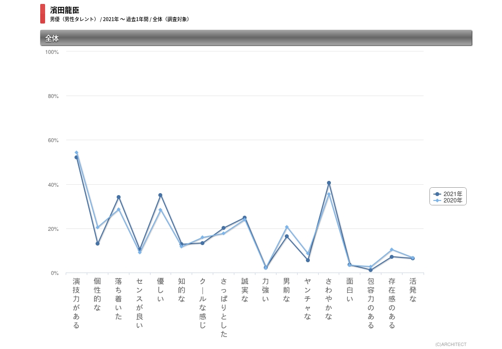 濱田は現在、どのようなイメージを持たれているのか。2021年のイメージワード調査の結果を見ると、「演技力がある」が最も高く52.0%。その次に「さわやかな」が40.6%、「優しい」が35.1%、「落ち着いた」が34.2%、「誠実な」が24.9%で続く。演技力があり、さわやかで優しい好青年のイメージが強いことが分かる。