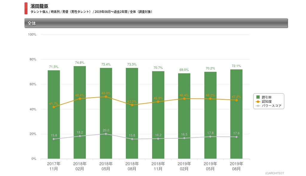 濱田龍臣タレントパワー時系列(2017年11月〜2019年08月 )濱田のタレントパワーの推移を見ると、2017年11月に41.7%だった認知度が、2018年5月に49.9%と大きく上がっていることが分かる。それに伴い、認知度に誘引率を掛け合わせたパワースコアは、15.8%から20.0%にまで上昇した。これは『ウルトラマンジード』『モブサイコ100』『花のち晴れ~花男Next Season~」と連続ドラマに立て続けに出演した時期だ。それから現在まで、認知度47〜48%、パワースコア17%前後をキープしている。