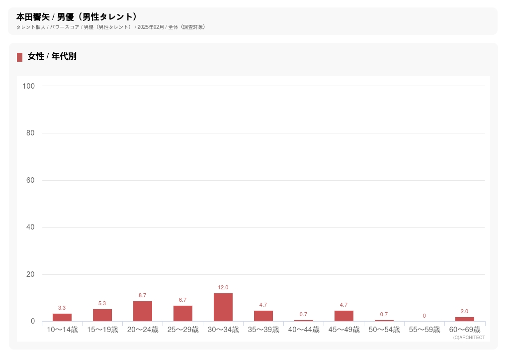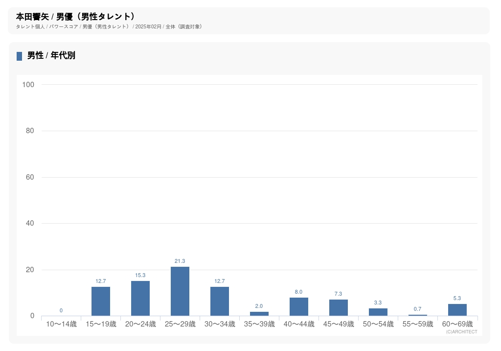 25年2月のタレントパワー調査を基に、本田の支持層を調べてみた。ファンが最も多かったのは、ダントツで25歳~29歳の男性。2番目は20~24歳男性、3番目は15〜19歳男性と30〜34歳男性が同率で並ぶ。イケメン俳優としては珍しく、同性の、しかも同世代からの支持が高いことが分かる。女性では30〜34歳と20〜24歳が高かった。『波うららかに、めおと日和』 では女性の“沼落ち”が多いことから、5月調査(6月集計)では支持層に変化が表れる可能性がある。