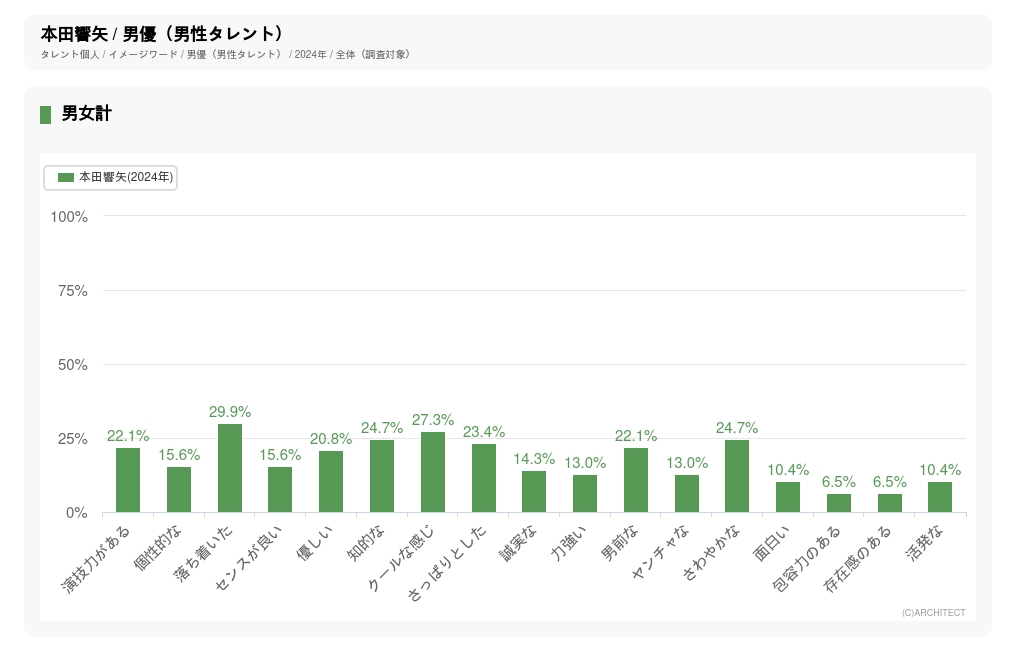 イメージワード/2024年/男女計タレントパワーランキングでは、年に1度、イメージワード調査も行っている。本田のイメージワードの1位は29.9%の「落ち着いた」。2位は27.3%の「クールな感じ」、3位には24.7%で「知的な」「さわやかな」が並ぶ。静かに落ち着いた光を放つ、月型の魅力を持っているといえるだろう。以降は「さっぱりとした」「演技力がある」「男前な」「優しい」が20%台で続く。グラフの形が似た「相似タレント」としてデータが弾き出したのは、中川大輔、杢代和人、駒木根葵汰、井上祐貴だった。