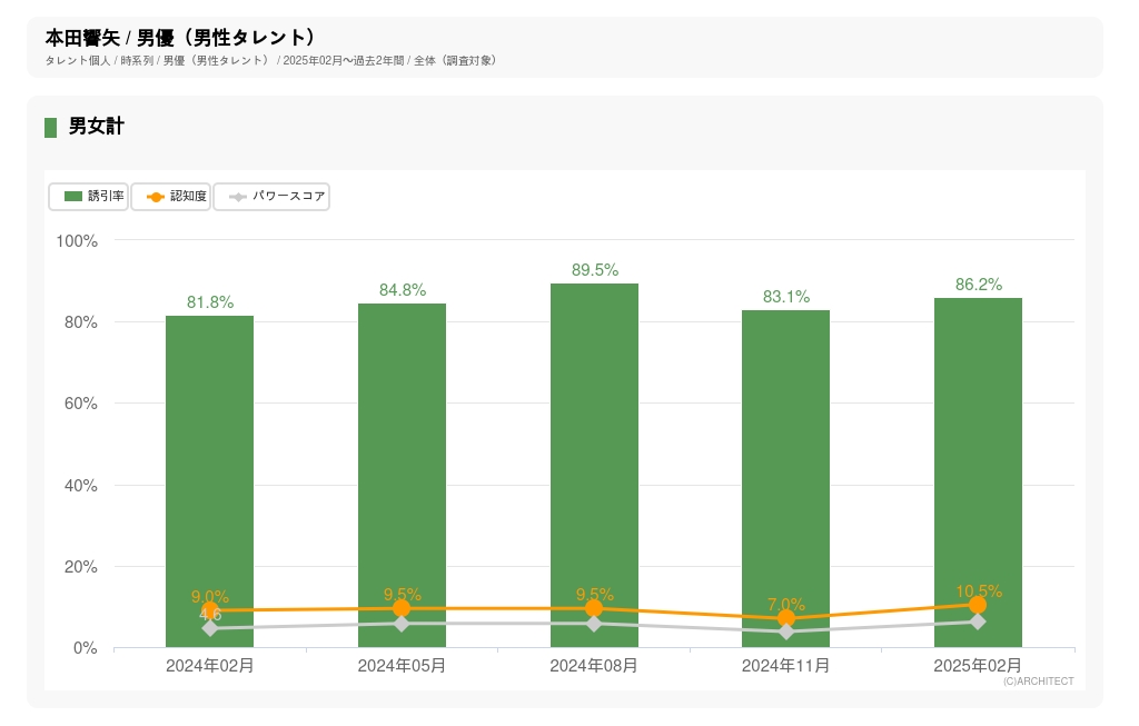時系列(2024年2月~2025年2月)/男女計タレントパワーランキングでは、年に4回、合計4400人のモニターに認知度や誘引率(「見たい、知りたい」の指標)についてのアンケート調査を行う。本田の調査結果を見ると、24年2月に9.0%だった認知度が、5月に9.5%に上昇。11月に少し下がったものの、25年2月に10.5%まで大きく伸ばした。誘引率が最も高かったのは、24年8月。6月に『虎に翼』、7月に『彩香ちゃんは弘子先輩に恋してる』(MBS)、8月に『恋愛バトルロワイヤル』が放送・配信された時期だ。認知度に誘引率を掛け合わせて算出した「パワースコア」は、24年2月は4.6だったが、25年2月に6.2に上昇。5月調査(6月集計)では『波うららかに、めおと日和』『すぱいす。』の影響で最高スコアを記録しそうだ。