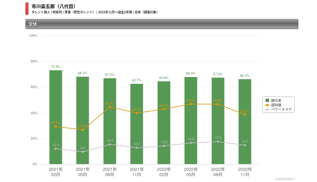市川染五郎_時系列タレントパワーランキングでは、年4回、計4400人のモニターにアンケート調査を行う。染五郎の認知度と誘引率(「見たい、知りたい」の指標)の調査結果を見ると、21年2月に29.4%だった認知度が、半年後の8月には44.4%に急上昇。これは『サイダーのように言葉が湧き上がる』のプロモーションでメディアに多く露出したことが要因と思われる。認知度が46.8%にまで達したのは、22年5月。これは『鎌倉殿の13人』への出演効果と言えるだろう。