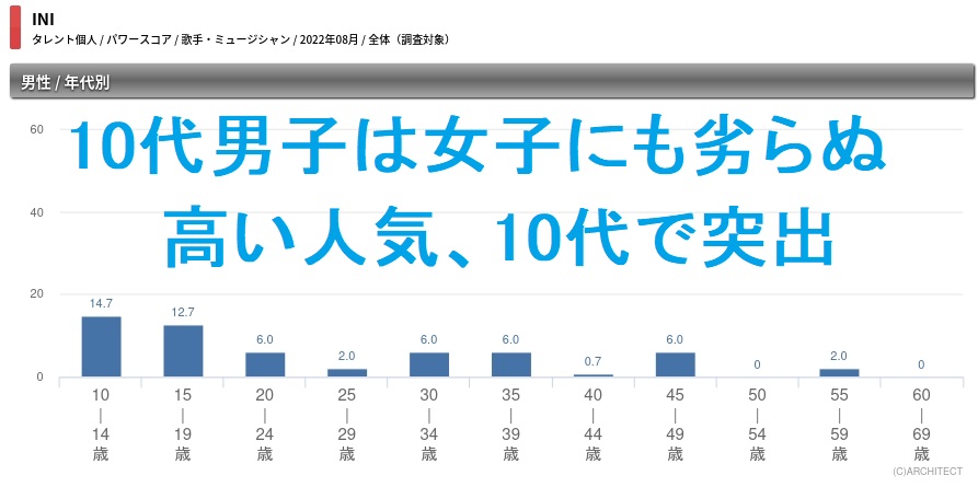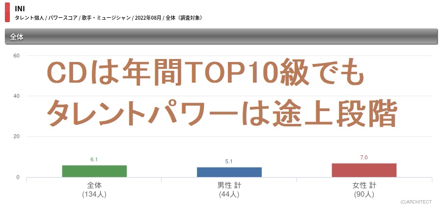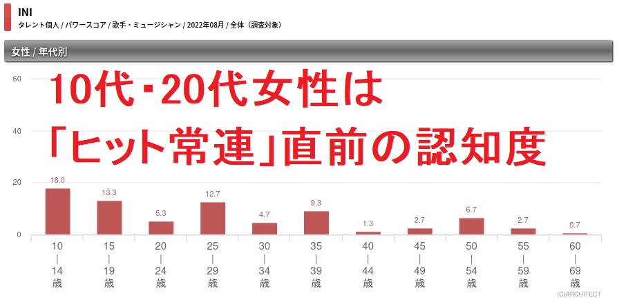 INIのタレントパワースコア、2022年8月:全体、全男性、全女性全体でのタレントパワーは途上段階、しかし既に10代男女と20代女性では大ブレイク寸前の支持