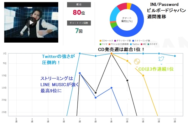 INI「Password」ビルボードジャパンの総合&部門別で見たチャートアクションデビュー作から3作連続で年間TOP10クラスのCDセールス。Twitterでは上位常連