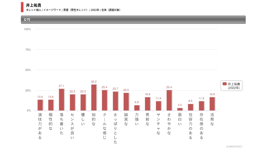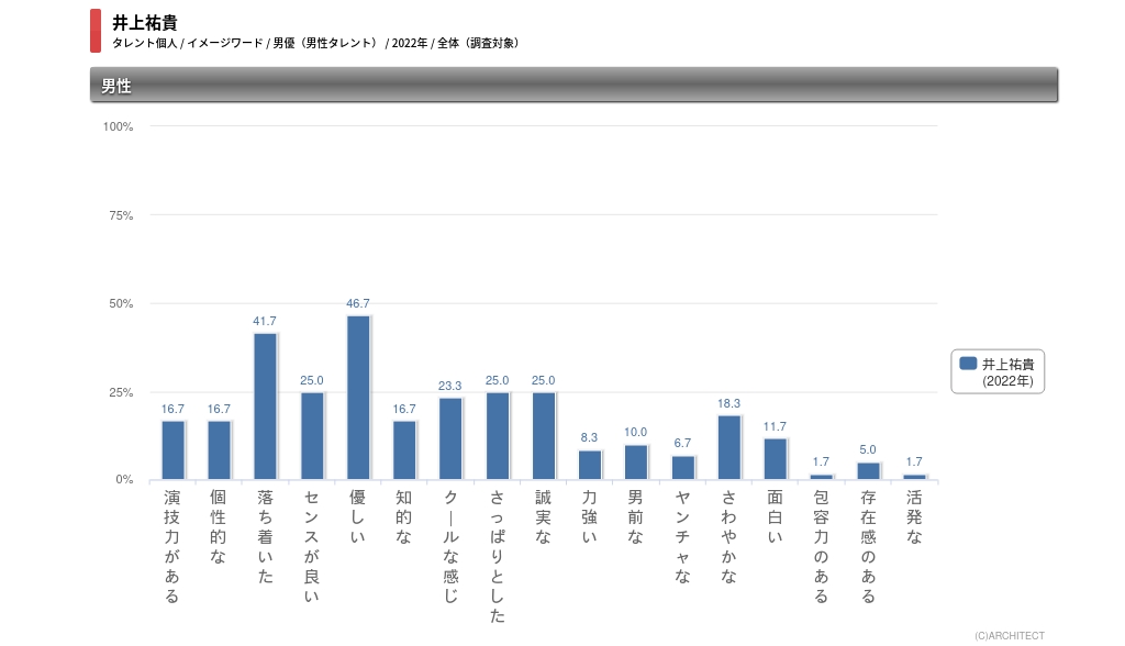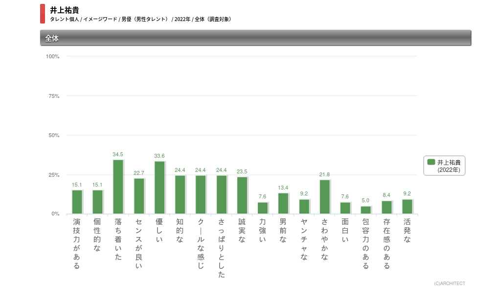 井上祐貴_イメージワード_全体タレントパワーランキングでは、年に1度、イメージワード調査も行っている。井上の22年のイメージワード調査の結果を見ると、「落ち着いた」が34.5%で1位。2位は「優しい」で33.6%。3位には「知的な」「クールな感じ」「さっぱりとした」が24.4%で並んでいる。落ち着いた雰囲気の、優しく知的な青年といったイメージが強いようだ。