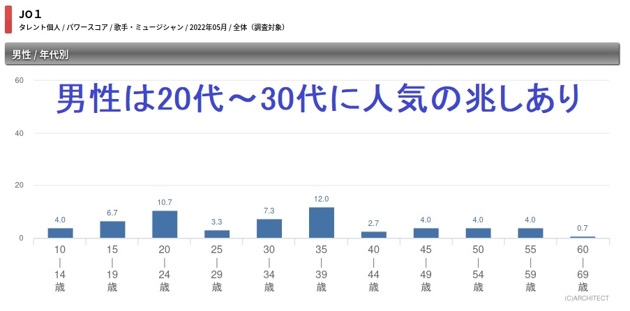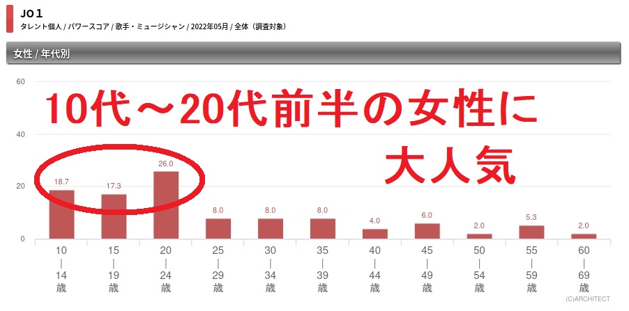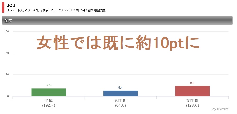 さらに彼らのタレントパワースコアを見てみると、2022年5月時点で、全体では7.5ポイント。彼らほどのメガヒットを飛ばしているアーティストなら10~15ポイントあってもおかしくないが、それだけ限られたファンに熱く支持されているということだろう。(タレントパワースコアは、一般のユーザーが「名前や顔を知っている」×「実際に見たり聞いたりしてみたい」で回答した数値なので、CD購入枚数とは一致せず、むしろCDを購入しないファンにもどれだけ広がっているか、というのが見える指標と言える。)