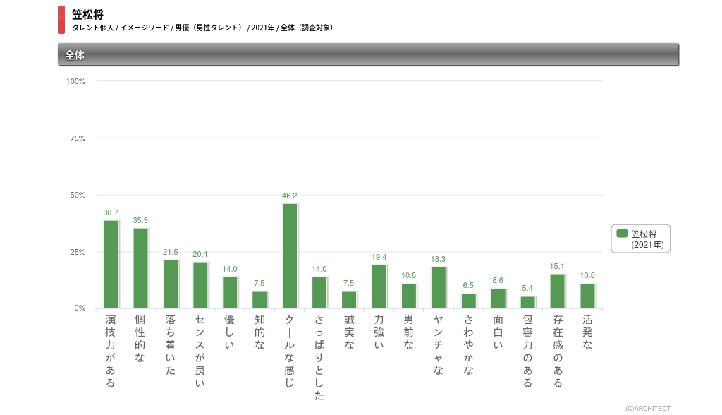 笠松将 イメージワード(2021年)タレントパワーランキングでは、イメージワード調査も行っている。笠松の最新調査結果を見ると、1位は「クールな感じ」で46.2%、2位は「演技力がある」で38.7%、3位は「個性的な」で35.5%となっている。4位以下は「落ち着いた」「センスが良い」「力強い」「ヤンチャな」「存在感のある」と続く。これらを見ると、不良学生やヤクザ役などアウトローのイメージが強そうだが、さらに下には「優しい」「さっぱりとした」といったイメージワードもあり、幅広いイメージを持たれていることが分かる。