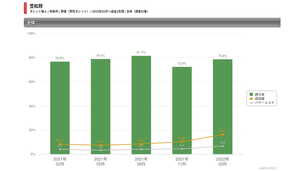 笠松将 時系列(2022年2月~過去2年間)タレントパワーランキングでは、年4回、4400人のモニターにアンケート調査を行っている。笠松の認知度と誘引率(「見たい、知りたい」の指標)の調査結果を見ると、21年2月に8.3%だった認知度は、22年2月に16.3%と約2倍にまで上昇している。誘引率は、21年8月が最高値で81.7%。前後も70〜80%を維持している。