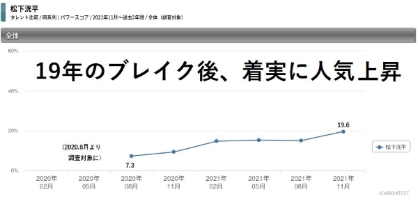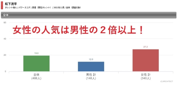 そんな彼のタレントパワースコアを見ると、全体ではこの1年半で7ポイントから約20ポイントと3倍近くに増えている。「そこそこ人気で知られている」というスコアが15ポイントなので、国民全体で見ても人気者といって間違いないだろう。