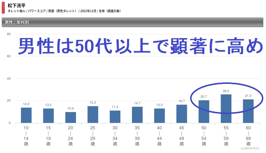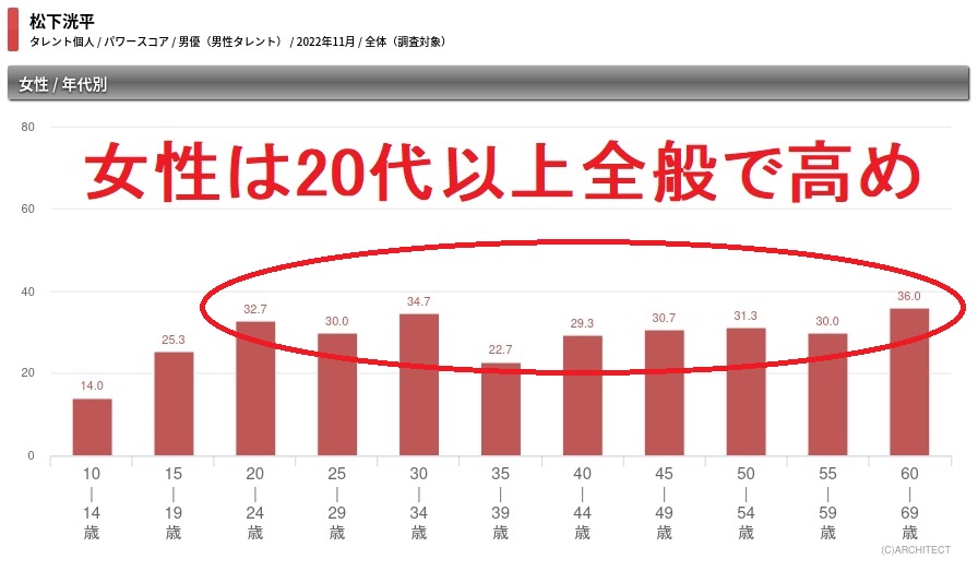 全体、全男性、全女性 でみた2021年11月、松下洸平のタレントパワースコア- パワースコア(2022年11月調査) 男性×年代別
