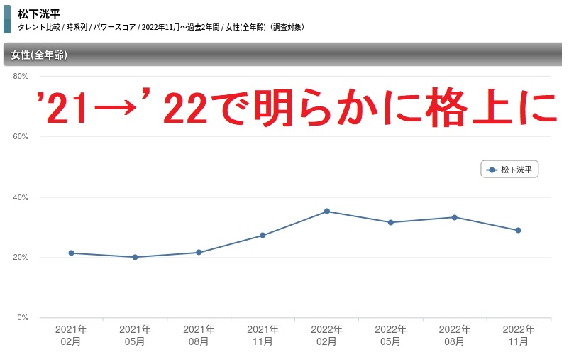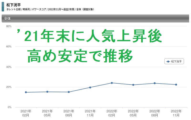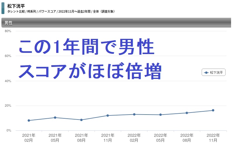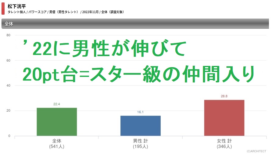ここで、松下洸平のタレントパワーのスコアを見てみると、2020年代に入っても着実に伸びており、特に2021年11月、2022年2月に、明らかに格上げしたことが分かる。この時期はちょうどTBS系ドラマ『最愛』にて主人公の女性に惹かれつつ取り調べる男性刑事を演じており、より深い演技が評価されたようだ。2022年11月のスコアを見てみると、全体で22.4ポイント、男性は16.1ポイント、女性は28.8ポイントと、多くの男性俳優同様に女性ファンが多いのだが、1年前と比べると、全体は+2.8ポイントに対し、男性は+4.1ポイント、女性は+1.6ポイントと、なんと男性ファンのスコアが人気の底上げになっているようだ。年代別で見ると、女性は相変わらず20代以上全般で人気があり、これが松下洸平の大きな強みなのだが、男性も50代以上で確実に伸びている。今後、大作映画やスペシャルドラマなど、大役にふさわしいタレントとして注目されるであろう。