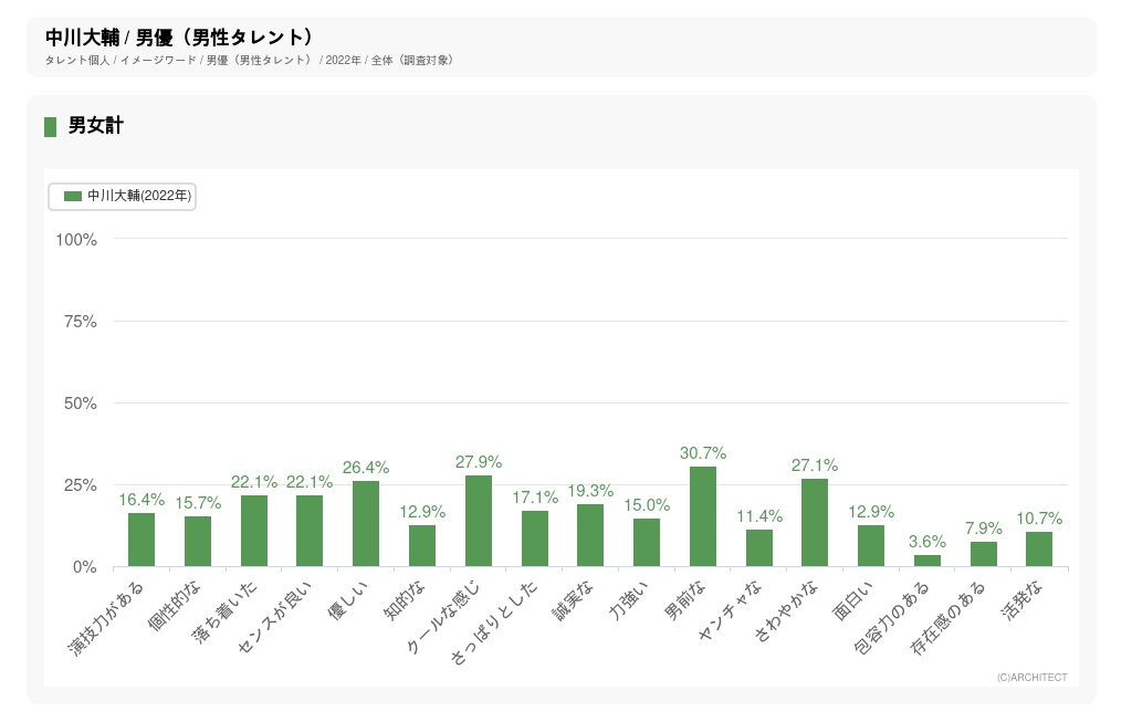 中川大輔イメージワードタレントパワーランキングでは、年に1度、イメージワード調査も行う。22年の調査結果を見ると、1位は「男前な」で30.7%、2位は「クールな感じ」で27.9%、3位は「さわやかな」で27.1%、4位は「優しい」で26.4%。以降、「落ち着いた」「センスが良い」が同率で並ぶ。「クール」「優しい」と相反するワードが上位に並ぶことから、幅広いイメージを得ていることが分かる。