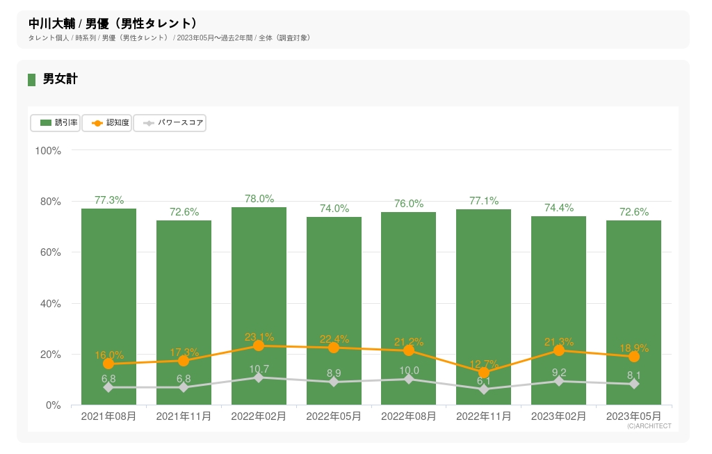 中川大輔_時系列タレントパワーランキングでは、年4回、合計4400人のモニターに、認知度や誘引率(「見たい、知りたい」の指標)についてのアンケート調査を行っている。中川の認知度は、21年8月の16.0%から上昇を続け、22年2月に最高値23.1%を記録。これは『30までに〜』と『卒業式に〜』の放送・配信が重なった時期だ。誘引率も同月が78.0%で過去最高、認知度に誘引率を掛け合わせて算出した「パワースコア」も10.7の最高値を記録している。以降、高水準を維持し、23年2月にまた上昇。これは『舞いあがれ!』や『大奥』への出演効果が大きそうだ。