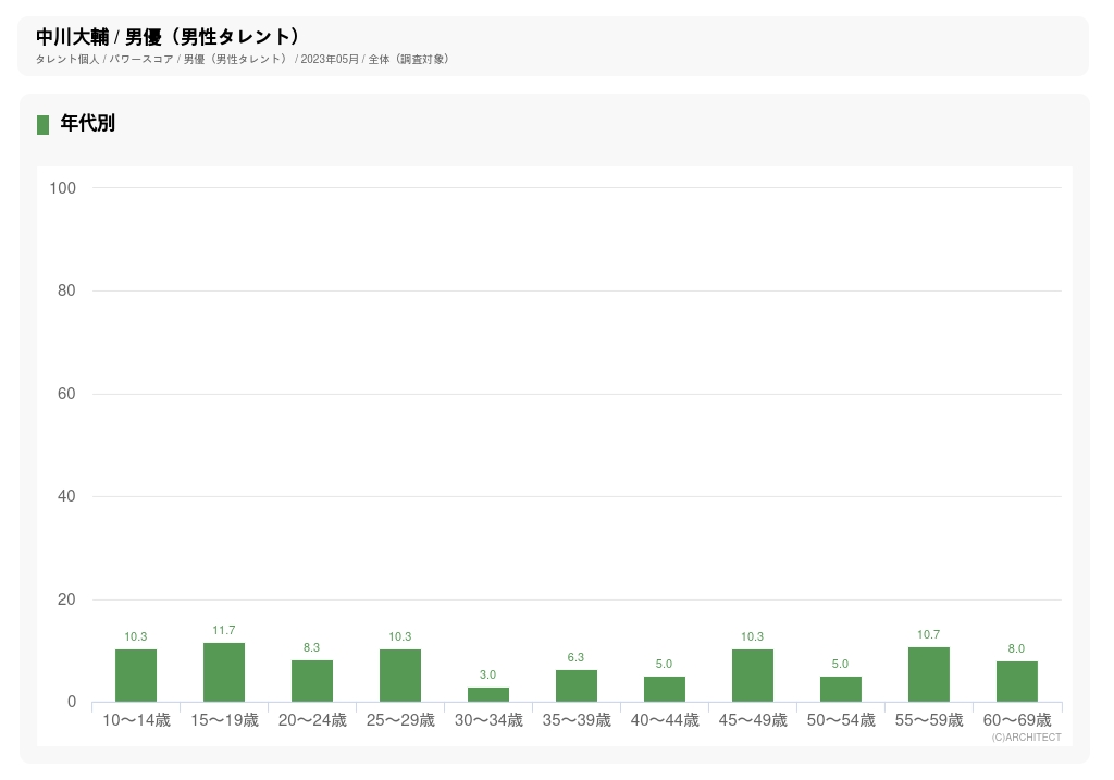 中川大輔_パワースコア最後に、23年5月調査のパワースコアから支持層を調べてみよう。最もファンが多いのは「15~19歳」で、2番目は「55~59歳」。以降「10~14歳」「25~29歳」「40~49歳」が続く。総じて10~20代に強く、40~50代の支持も高い。モデルとしての活動や「Zドラマ」などで若年層の支持を獲得し、『舞いあがれ!』『合理的にあり得ない』などで中高年も気になる存在になっているようだ。
