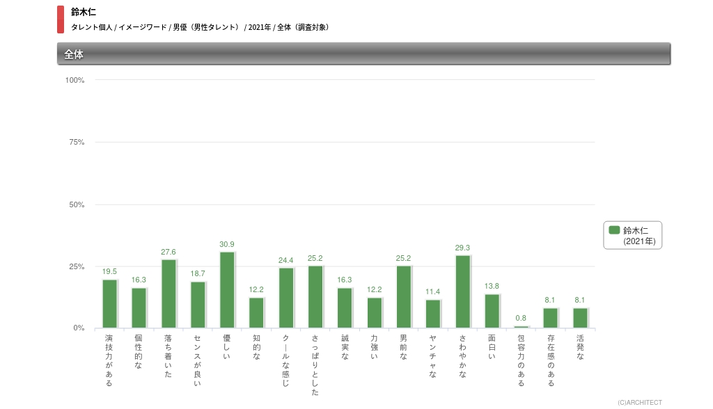イメージワード調査の結果は、1位が「優しい」で30.9%、2位が「さわやかな」で29.3%、3位が「落ち着いた」で27.6%。4位に「さっぱりとした」「男前な」が25.2%で並び、以降「クールな感じ」「演技力がある」「センスが良い」「誠実な」が続く。優しく清涼感のある、落ち着いた雰囲気を持った好青年というイメージが強そうだ。