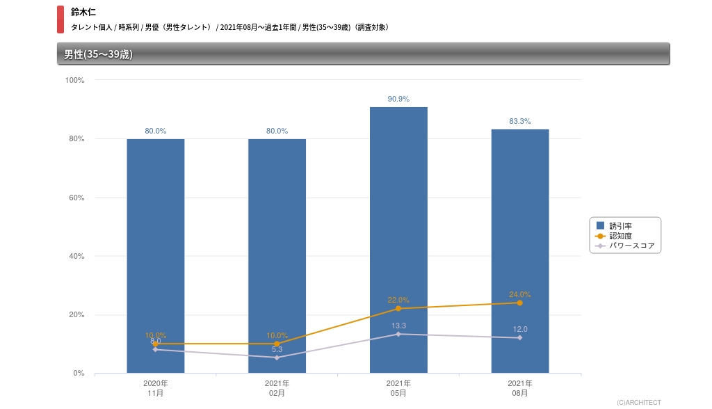 パワースコアが最も高いのは、女性15~19歳の層。2021年2月に認知度32.0%、誘引率93.8%、パワースコア20.7%という最高スコアを獲得しており、ハイティーンからの人気の高さがうかがえる。男性では35~39歳で最も高く、認知度は右肩上がり。2020年11月に10%だった認知度は、2021年8月に2倍以上跳ね上がり、24.0%をマークした。