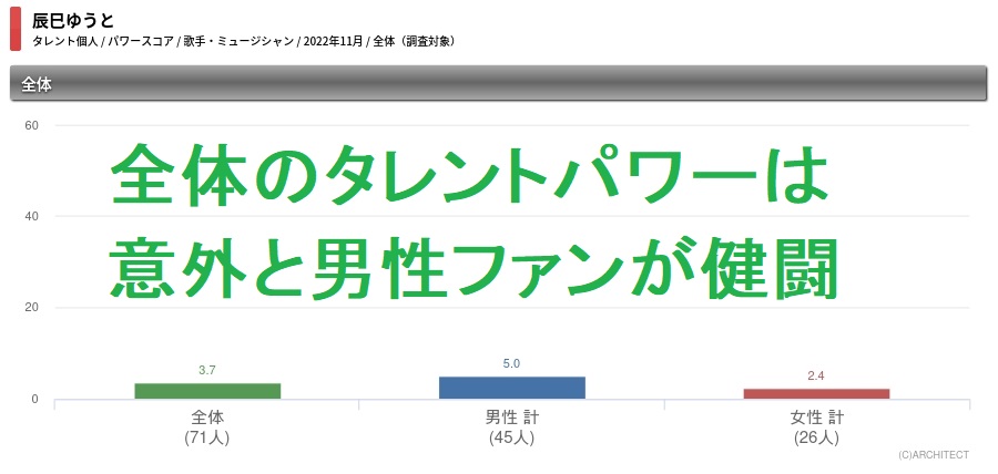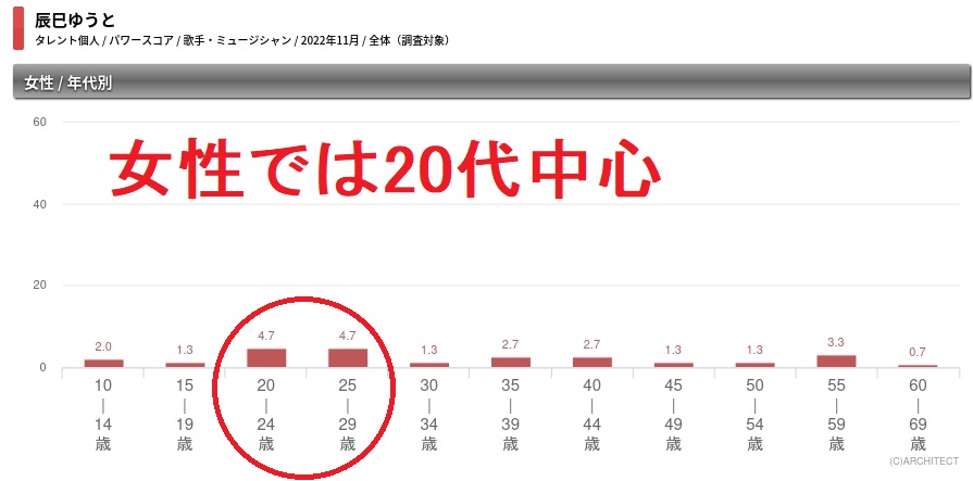 現在のタレントパワーのスコア(認知度×関心度)を見てみると、全体では3.7ポイントと、TOP10常連のアイドルグループ並みで、まだコアなファン中心に支えられているという状況だ。ただし、そういった熱烈な女性ファンの方は2.4ポイントなのに対し、男性は5ポイントと女性以上に高い。これは、「顔と名前を知っている」なおかつ「歌が流れていたら聴いてみたい」という実力がデビューから6年が経過し、浸透してきたと言えそうだ。実際、女性ファンは20代に突出しているのに対し、男性ファンは10代から50代まで幅広くスコアが出ており、今後に期待される。