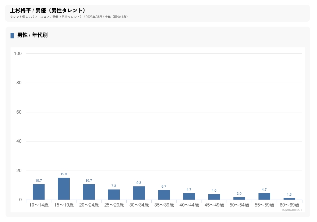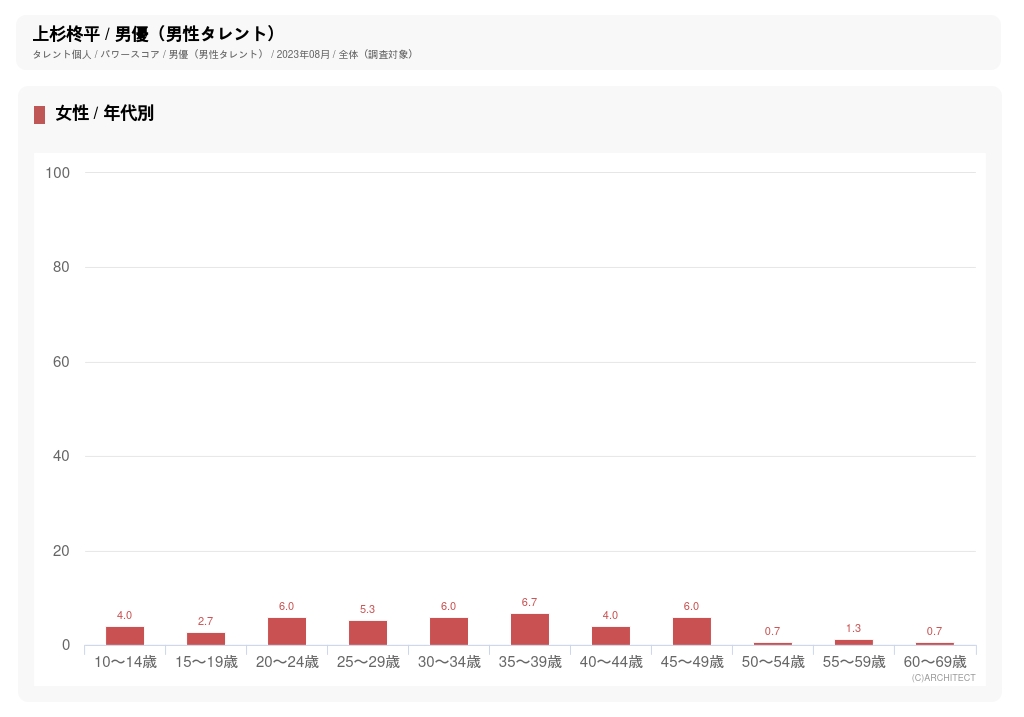 最後に、23年8月調査のパワースコアから、上杉の支持層を調べてみよう。最もファンが多かったのは「15~19歳男性」で、2位は同率で「10〜14歳男性」「20〜24歳男性」。意外にも女性より男性、しかも年下の若年層から支持が高いことから、「憧れの兄貴」的なイメージを持たれていることが考えられる。ちなみに女性は20代〜40代までの支持が特に高かった。