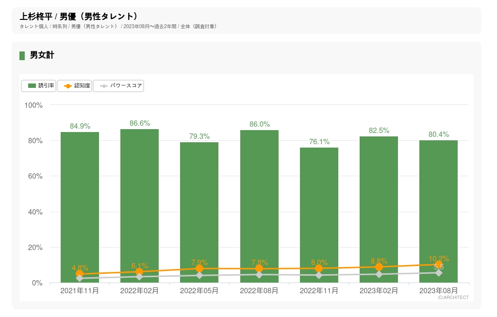 タレントパワーランキングでは、年4回、合計4400人のモニターに、認知度や誘引率(「見たい、知りたい」の指標)についてのアンケート調査を行っている。上杉の認知度は、21年11月の4.8%から右肩上がりで上昇を続け、最新の23年8月調査で最高値となる10.2%を記録している。認知度に誘引率を掛け合わせて算出した「パワースコア」も、23年8月に最高値に達した。直近で特に上昇率が高いのは、23年2月から8月にかけて。『18/40』の影響が大きそうだ。