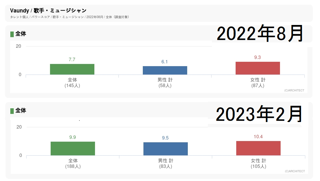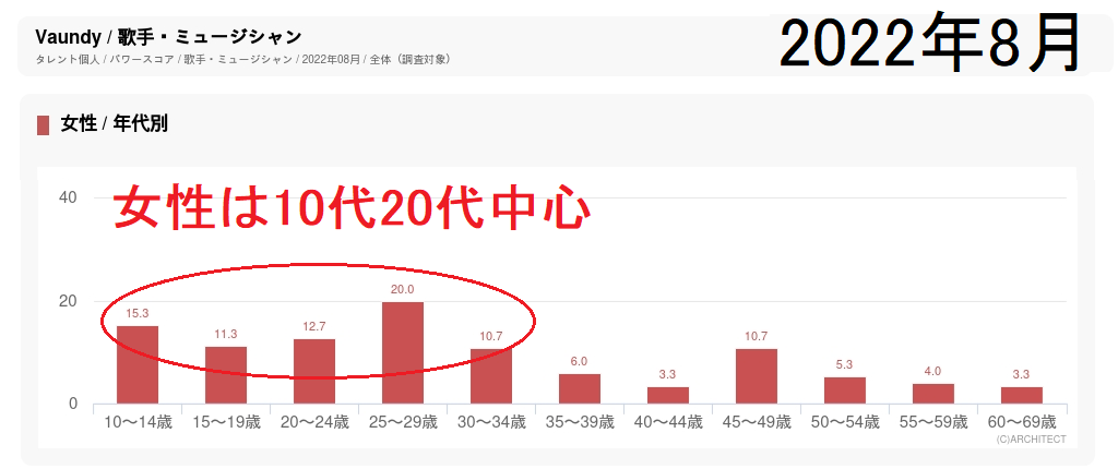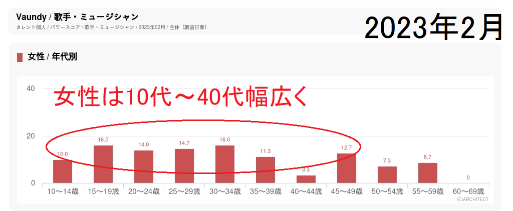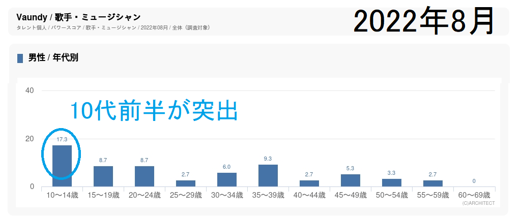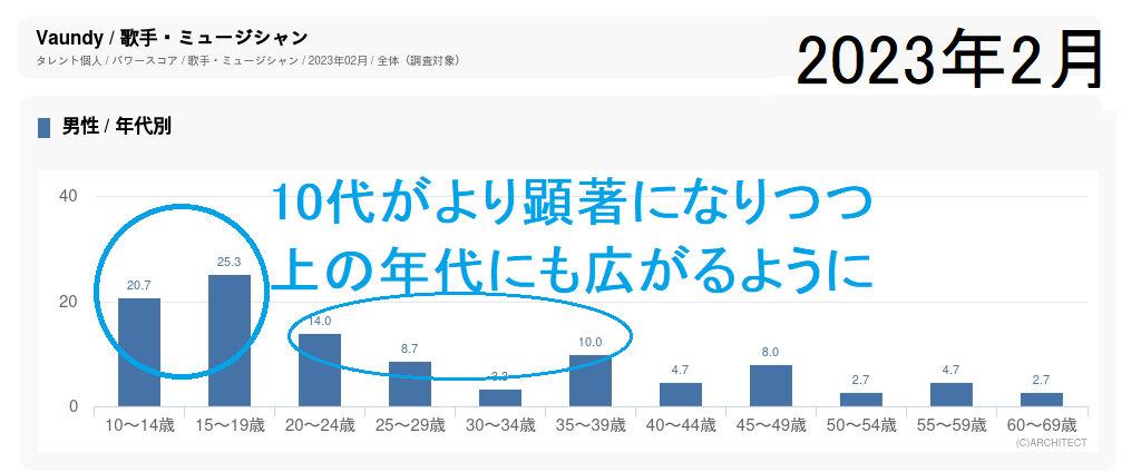 そんなVaundyのタレントパワーのスコアを、2022年8月と比べてみると、全体では+2.2ポイント、全男性では+3.4ポイント、全女性では+1.1ポイントと、これまでストリーミングから大ブレイクしたあいみょんやOfficial髭男dismと比べるとやや控えめに見える。これは、彼らがブレイク時期にテレビの大型特番などで大量に出演したことで、より大きな波に乗ったのに対し、Vaundyの場合は紅白後もメディア露出を抑えていたことの違いが大きいかもしれない。