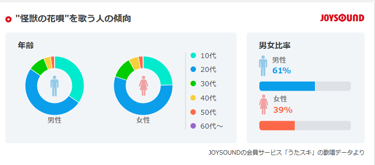 そうした実績から、2022年末にNHK紅白歌合戦に「怪獣の花唄」に初出場。その結果、元々好調だったストリーミングのみならず、ダウンロードでも週間1位を獲得、動画再生でもTOP10入りと急上昇。大きくファン層が広がったと言える。特に、人気なのがカラオケで、2022年からTOP30前後を推移し、年間39位となっていたものの、紅白出場後TOP10入り、2023年3月からは1位をキープしている。”紅白なんて、若者は誰も見ない”と言われがちだが、JOYSOUNDの性別×年代別のカラオケ歌唱傾向を見ると、10代男子+20代男女が圧倒的でやはり、紅白効果は若い世代にも健在と言えるだろう。