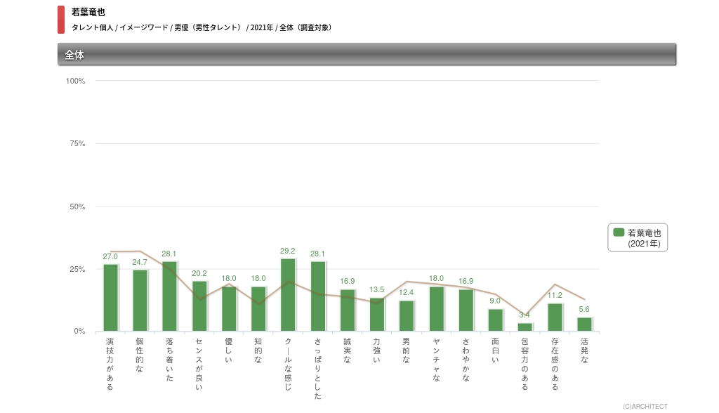 若葉竜也イメージワード全体それでは、全年齢の男女を対象に調査したイメージワードの結果はどうか。1位は「クールな感じ」で29.2%、2位は「落ち着いた」「さっぱりとした」が同率で28.1%となった。以降、「演技力がある」「個性的な」「センスが良い」と続く。男優(男性タレント)の平均である折れ線グラフと比較すると、「クールな感じ」「さっぱりとした」「センスが良い」などが上回っていることが分かる。