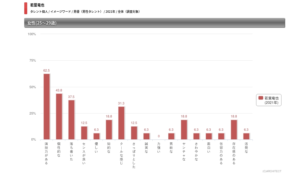 若葉竜也イメージワード女性(25~29歳)その女性25~29歳の層は、若葉にどんなイメージを抱いているのか。1位は62.5%で「演技力がある」、2位は43.8%で「個性的な」、3位は37.2%で「落ち着いた」となっている。演技力と個性を併せ持つ、落ち着いた大人の男優として評価されているようだ。