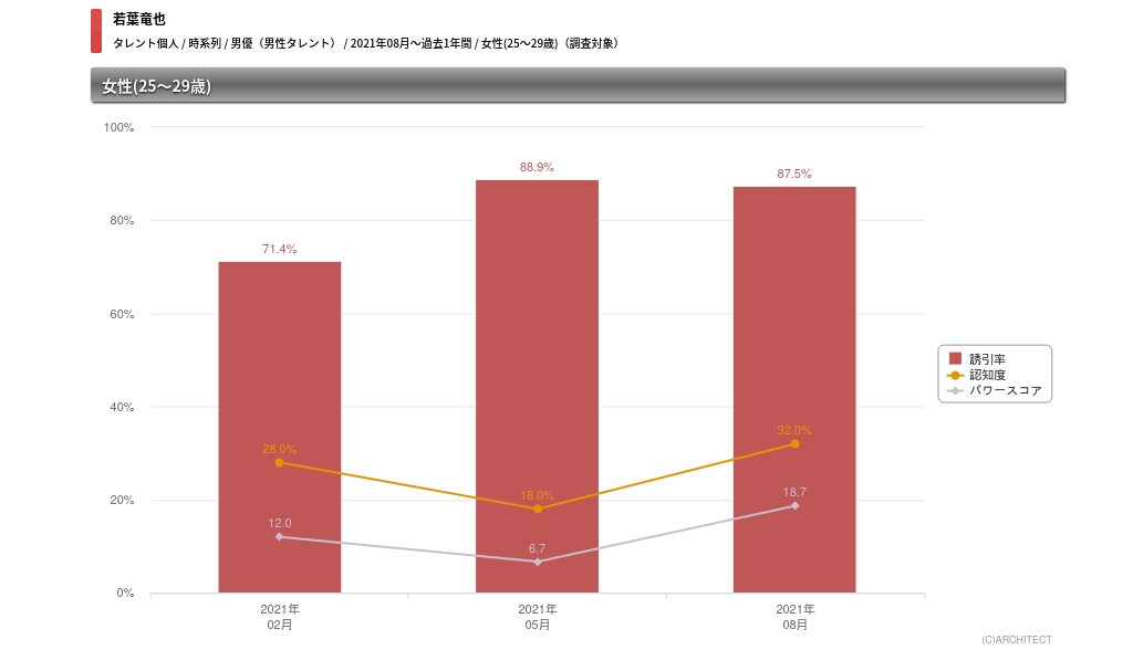 若葉竜也タレントパワー推移 女性 25~29歳2021年の若葉のタレントパワーを見ると、2月に7.9%だった認知度が、8月に8.1%に伸びている。特に伸びているのは、もともと高い数値を示している女性25~29歳の層だ(上グラフ)。朝ドラ放送時の2月は認知度28.0%だったが、放送後の8月には32.0%に。「見たい、知りたい」の指標である誘引率は71.4%から87.5%に跳ね上がり、パワースコア(認知度に誘引率を掛け合わせて算出)は12.0%から18.7%に上昇した。