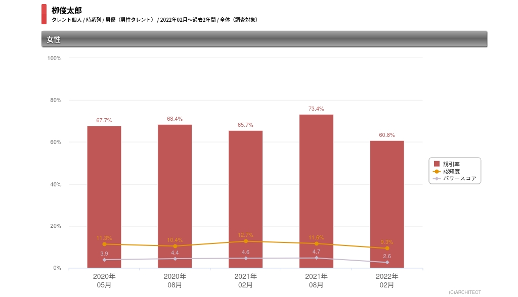 タレントパワーの男女別のデータを見ると、認知度は女性の方が高く、誘引率は男性の方が高い結果に。女性に幅広く知られている一方で、男性には「気になる存在」になっているようだ。