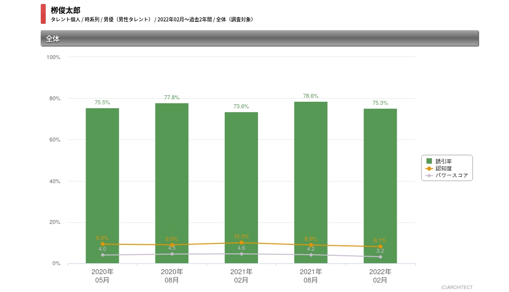 タレントパワーランキングでは、年4回、計4400人のモニターにアンケート調査を行っている。栁の認知度と誘引率(「見たい、知りたい」の指標)の調査結果を見ると、20年5月に9.3%だった認知度は、21年2月に10.0%に上昇している。これは20年8月に公開された映画『弱虫ペダル』や、同年12月に配信されたNetflixの『今際の国のアリス』などの影響が強そうだ。