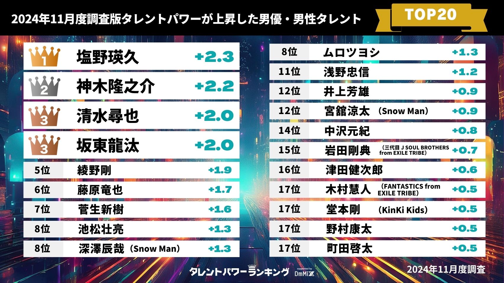 このランキングは、株式会社アーキテクトが実施している業界最大規模のタレント調査『タレントパワーランキング』をもとに男優・男性タレント部門で前回の調査(2024年8月度)と比べてパワースコアが上昇した順にまとめました。