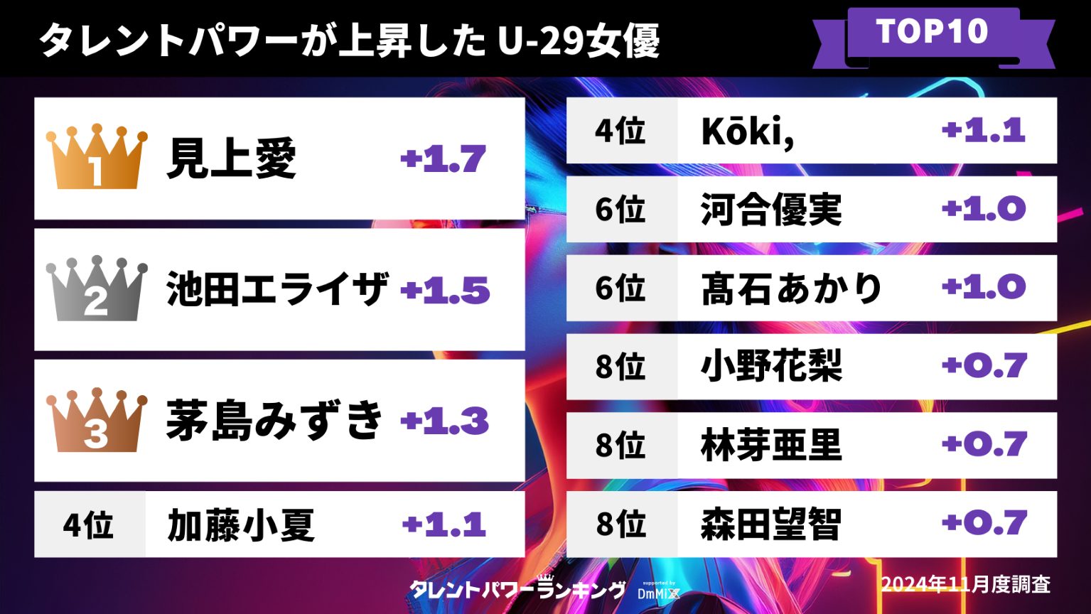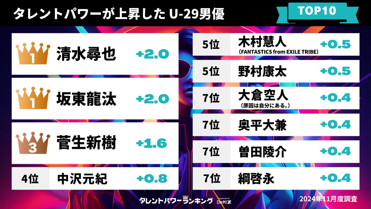 今回のランキングは、2024年11月度に行われた最新調査において、前回(2024年8月度)と比べてパワースコアの上昇率が大きかったタレントのランキングから29歳以下の男優・女優を抽出して作成しています。年齢は2025年3月14日時点です。