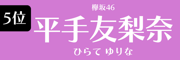 5位は、平手友梨奈です。2015年、1期生オーディションに合格。2018年公開の『響-HIBIKI-』で映画初出演して、日本アカデミー賞新人俳優賞を受賞。2020年に欅坂46を脱退しました。
