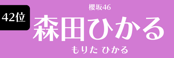 森田ひかる(櫻坂46)も同じく42位です。2018年、「坂道合同新規メンバー募集オーディション」に合格して、2期生として活動開始。櫻坂46の1stシングル『Nobody’s fault』で表題曲のセンターを務めました。