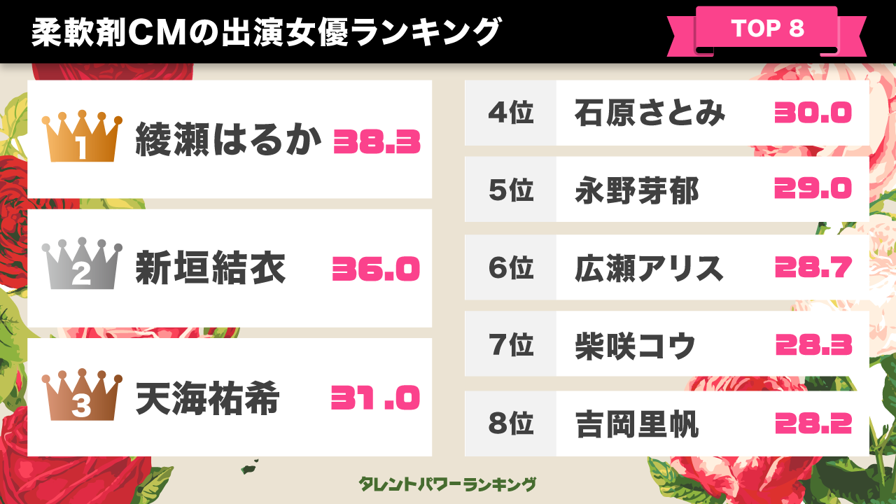 【柔軟剤のCM】女優人気ランキングは、株式会社アーキテクトが実施する業界最大規模のタレント調査『タレントパワーランキング』をもとにパワースコアを算出、こちらのデータからランキングが作成されています。