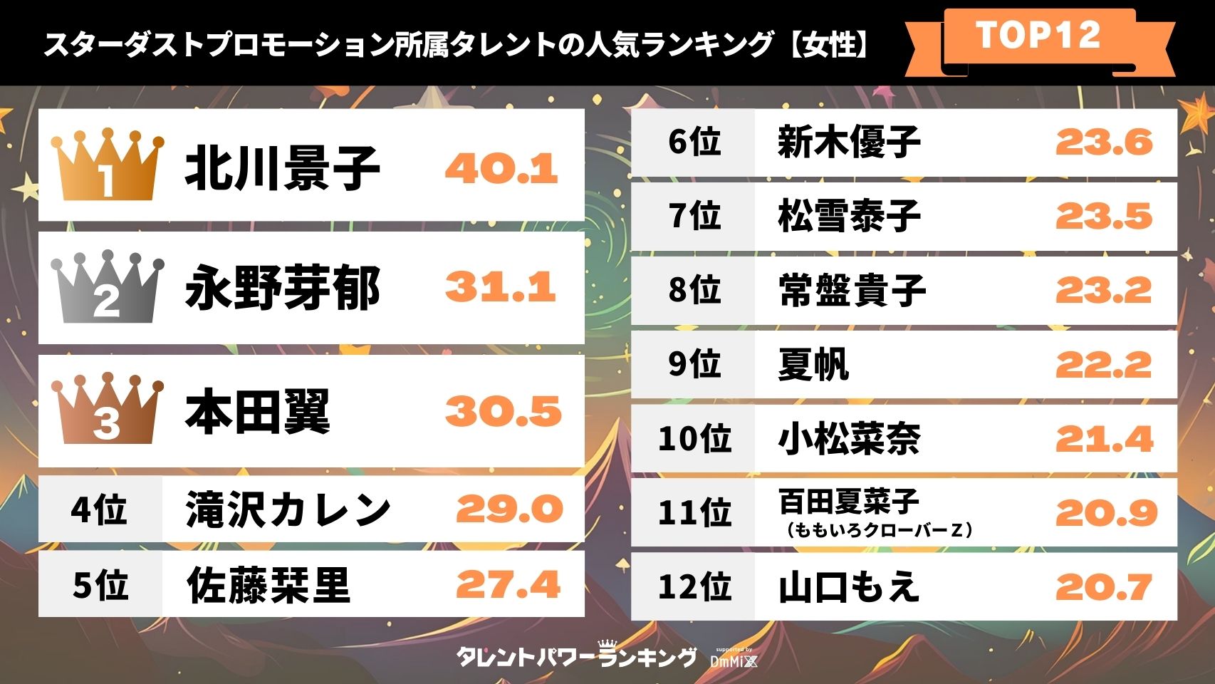 スターダストプロモーション所属タレントの人気ランキング【女性】