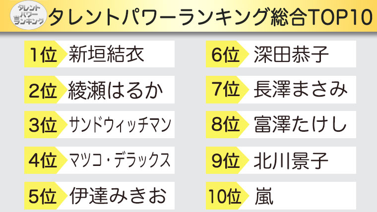 タレントパワーランキング総合TOP10は上記のようになりました。