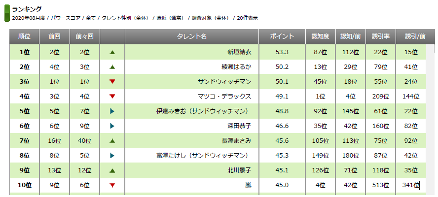 タレントパワーランキングランキング総合TOP10【2020年08月度 / パワースコア / 1~10位】