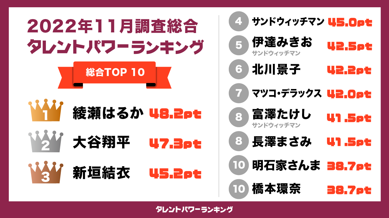 このほど、アーキテクトが実施しているタレントパワーランキングの2022年11月度最新調査の結果がまとまりました。1位は前回の8月度調査に続いて、綾瀬はるか。秋はドラマ・映画出演はありませんでしたが、11月1日には都内で行われた『「コカ・コーラ」FIFA ワールドカップ 開催国ボトル発売記念イベント』にサッカー元日本代表の中村俊輔とともに出席して多くのメディアに取り上げられたほか、11月2日には木村拓哉と夫婦役で共演する映画『THE LEGEND & BUTTERFLY』(2023年1月27日公開)のセリフ初出しとなる第2弾特報映像が公開されて注目を集めました。