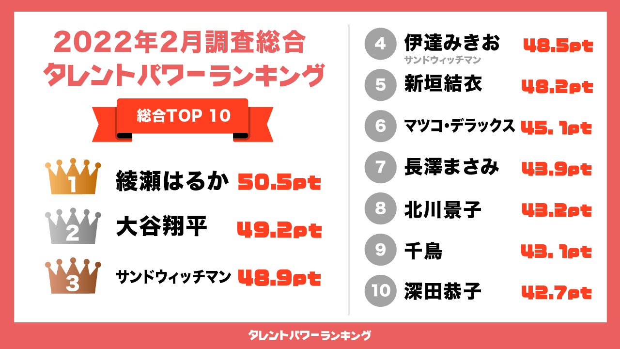 パワースコアとは、タレントの認知度(顔と名前を知っている)と誘引率(見たい・聴きたい・知りたい)の調査結果から算出した値です。今回のランキングは、2022年2月度に行われた調査をもとに作成しています。