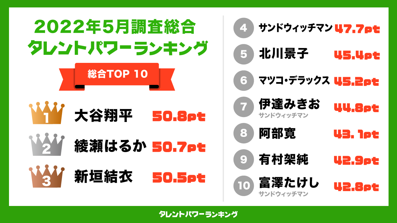 パワースコアとは、タレントの認知度(顔と名前を知っている)と誘引率(見たい・聴きたい・知りたい)の調査結果から算出した値です。今回のランキングは、2022年5月度に行われた調査をもとに作成しています。