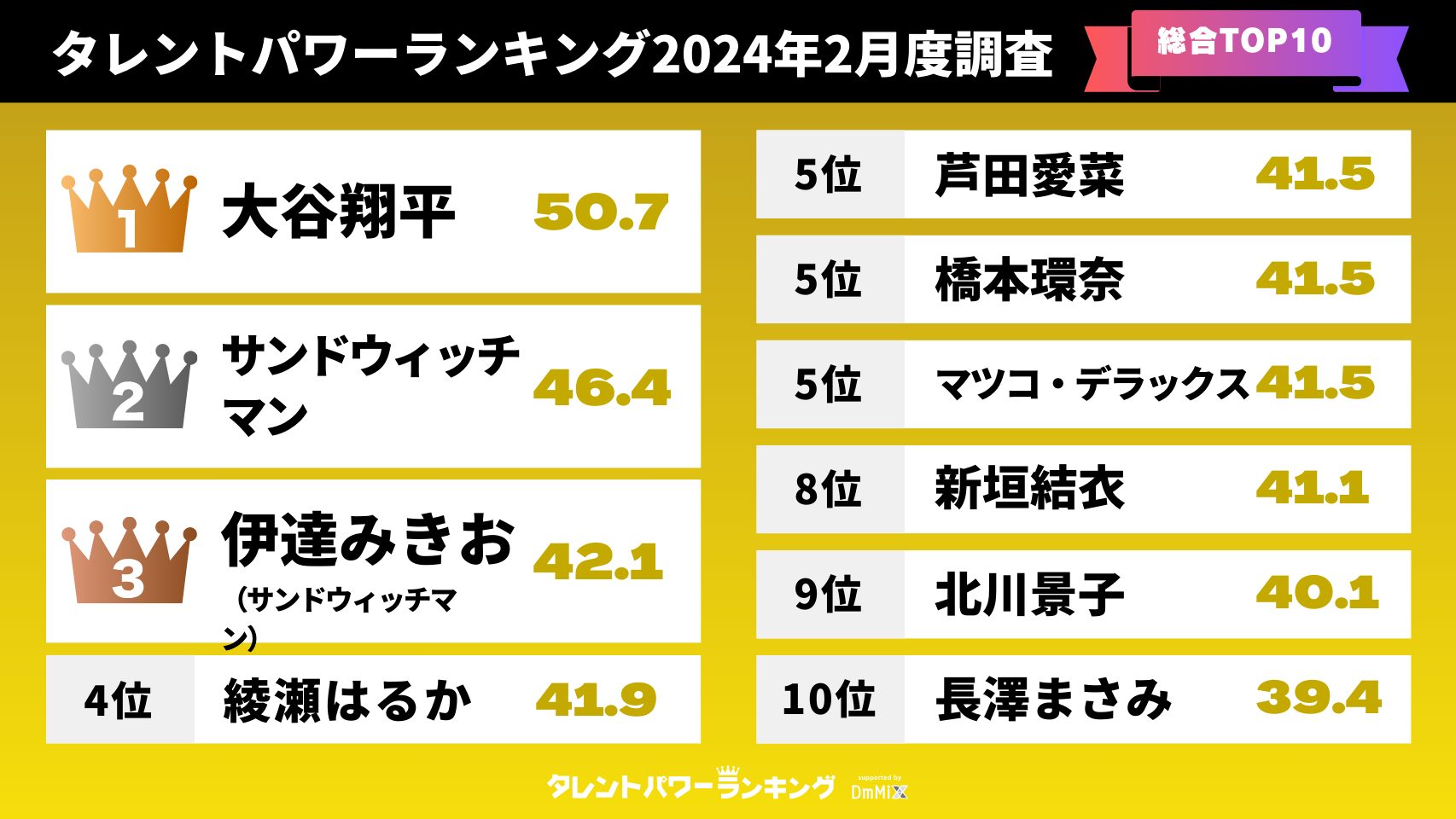 「タレントパワーランキング」総合TOP10!!