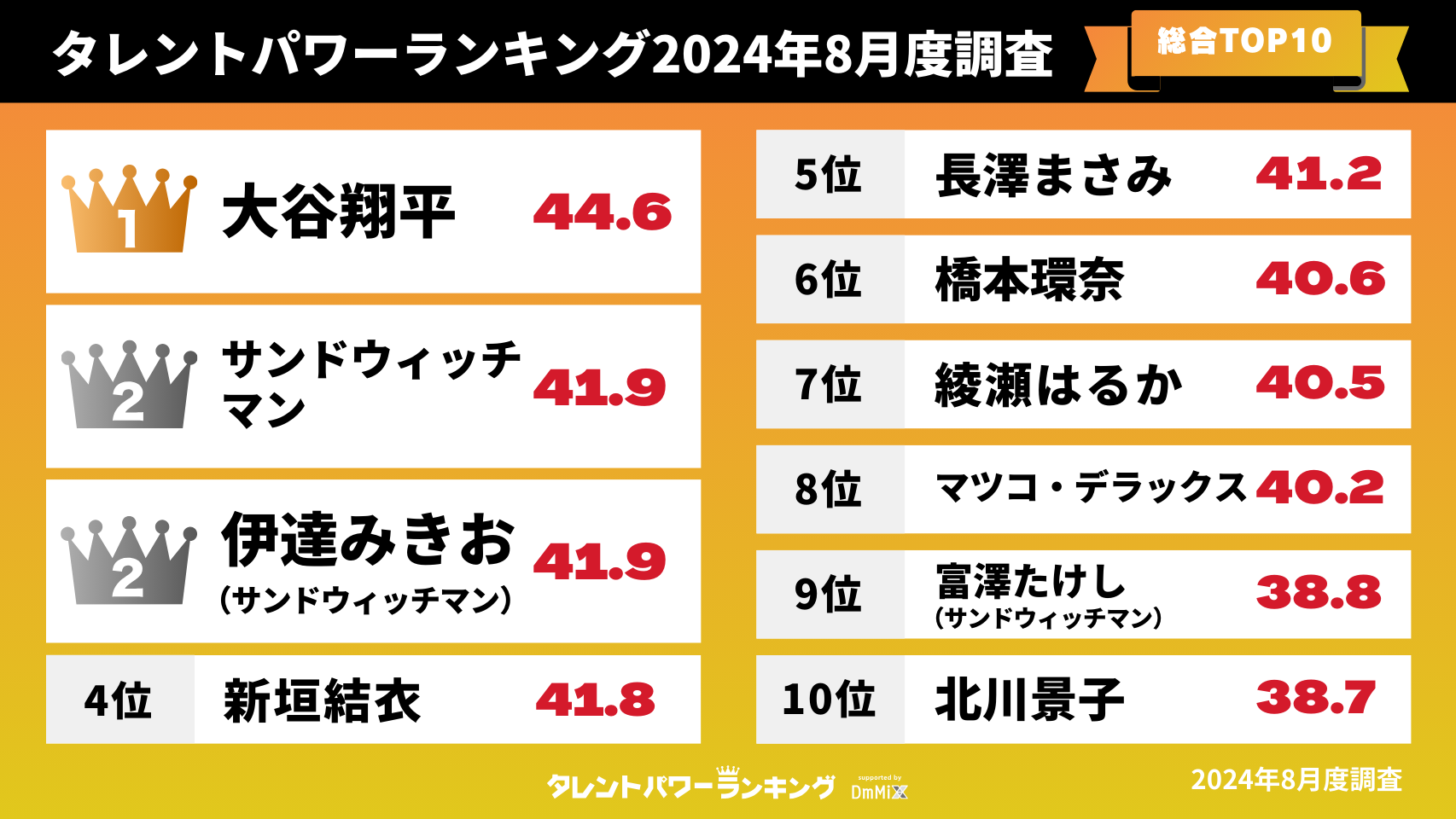 2位のサンドウィッチマンも前回と同じ順位です。8月には『サンドウィッチマンの禁断ランキング 今夜決定!高校野球ファンが選ぶ高校球児ランキング』『サンドのパリ五輪総集編メダリストが最速大集合!名場面㊙️全舞台ウラSP』(ともにテレ朝系)の特番2番組のMCも担当しました。個人では伊達みきおが前回6位からコンビとしての順位と同率の2位に上昇、富澤たけしは7位から9位に順位を2つ落としています。