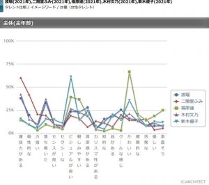 アーキテクトが実施しているタレントパワーランキングでは、そのタレントの名前も顔を知っていると答えた回答者に用意したワードの中から3つ選んでもらい、どのようなイメージを持っているかを聞くイメージワード調査を行っています。