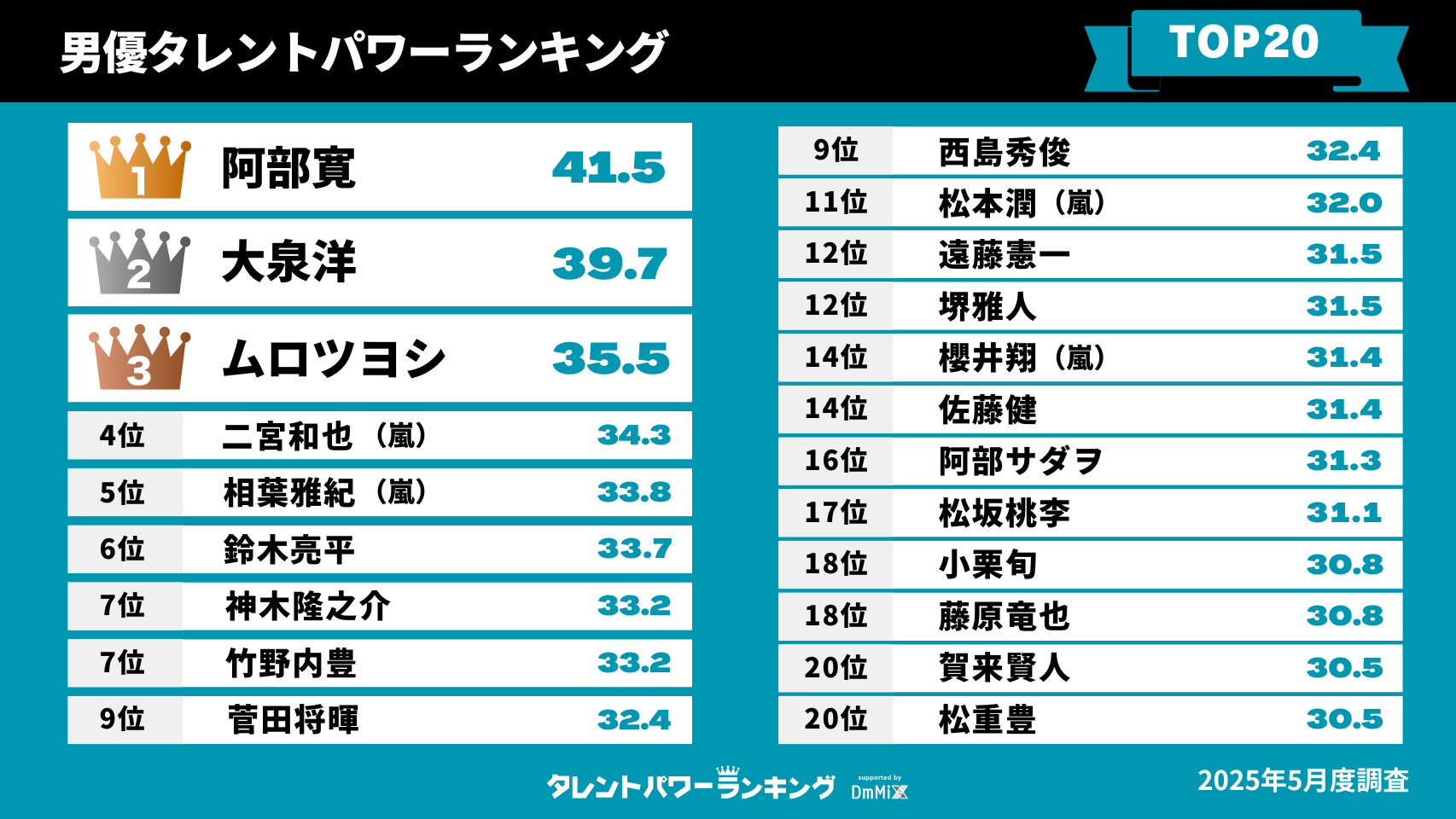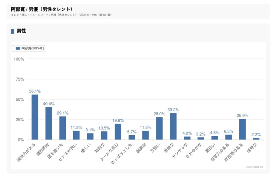 ──タレントパワーランキングは認知度と「もっと見たい、知りたい」という関心度の高さを示す誘引率のスコアをかけあわせて算出されるもので、単に知名度だけではないというのが特徴です。その最新調査で、全年齢の男優の中で阿部さんが1位でした。