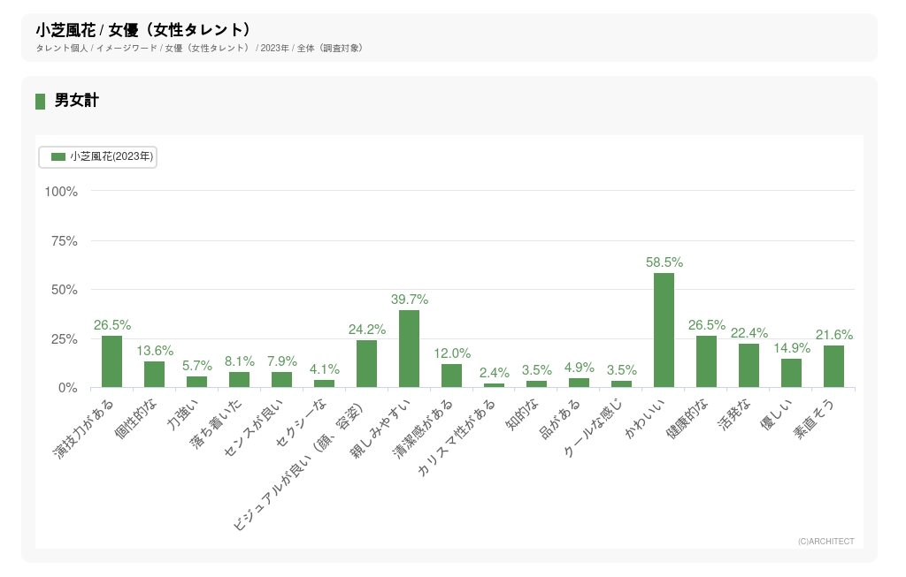 ──以前にも小芝さんにデータを見ていただいたことがありますが、タレントパワーランキングが実施しているイメージワード調査の最新調査での小芝さんのイメージのグラフが、こちらになります(下図)。