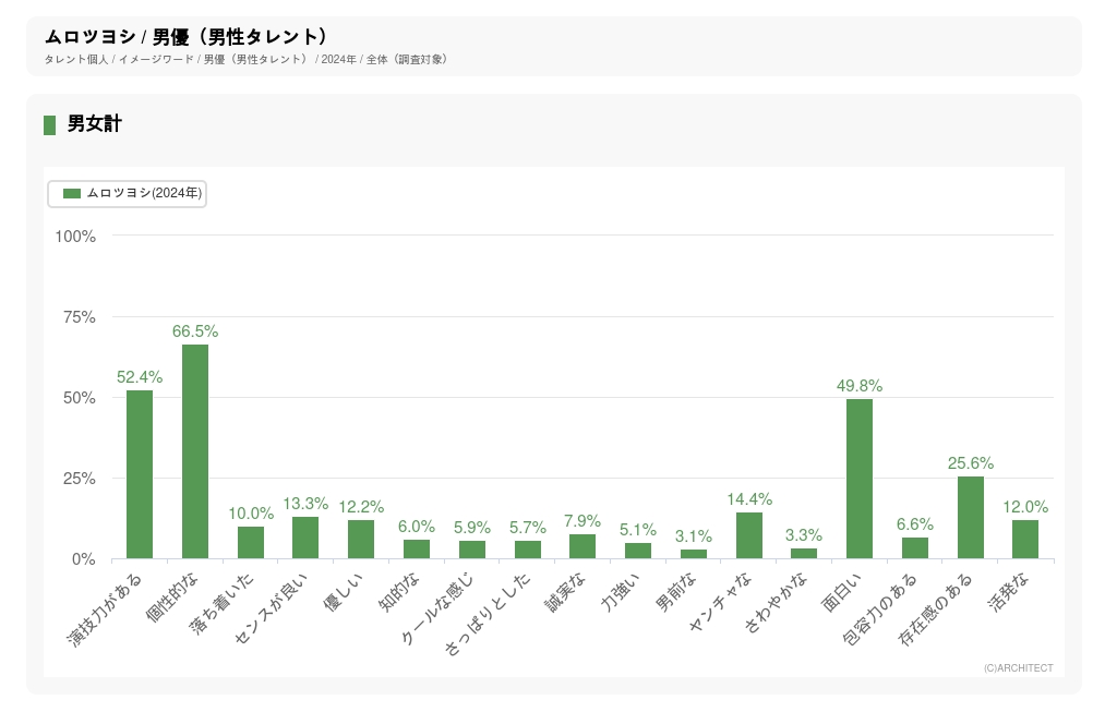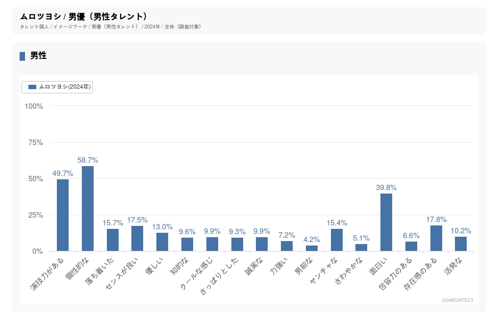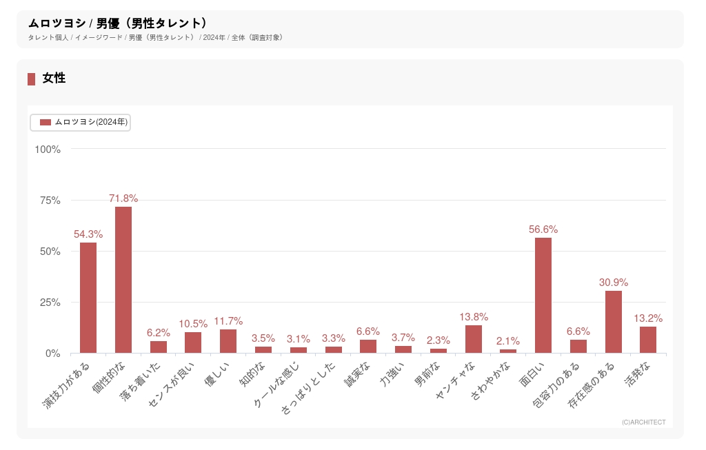 ──タレントパワーランキングではイメージワード調査というものも実施しています。こちらが用意したワードの中から3つ選んでもらって、どのワードの割合が高かったかをグラフ化しています。こちらがイメージワード調査でのムロさんの最新調査結果です。