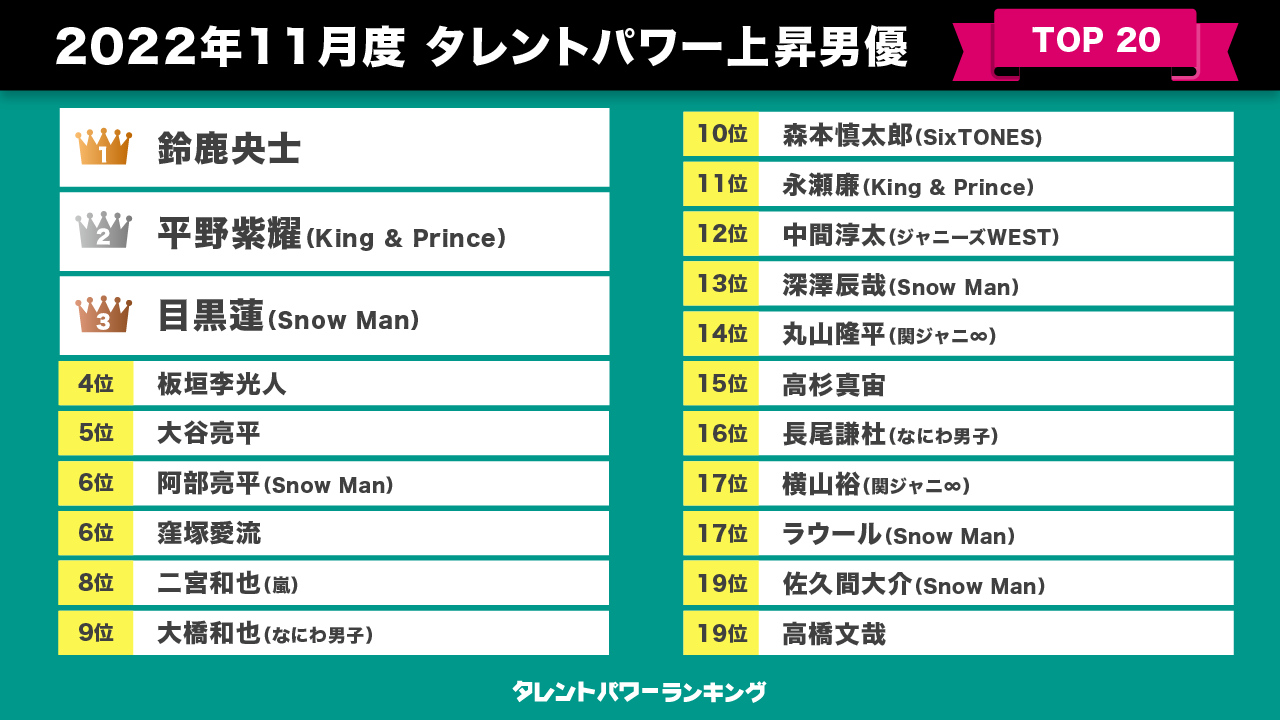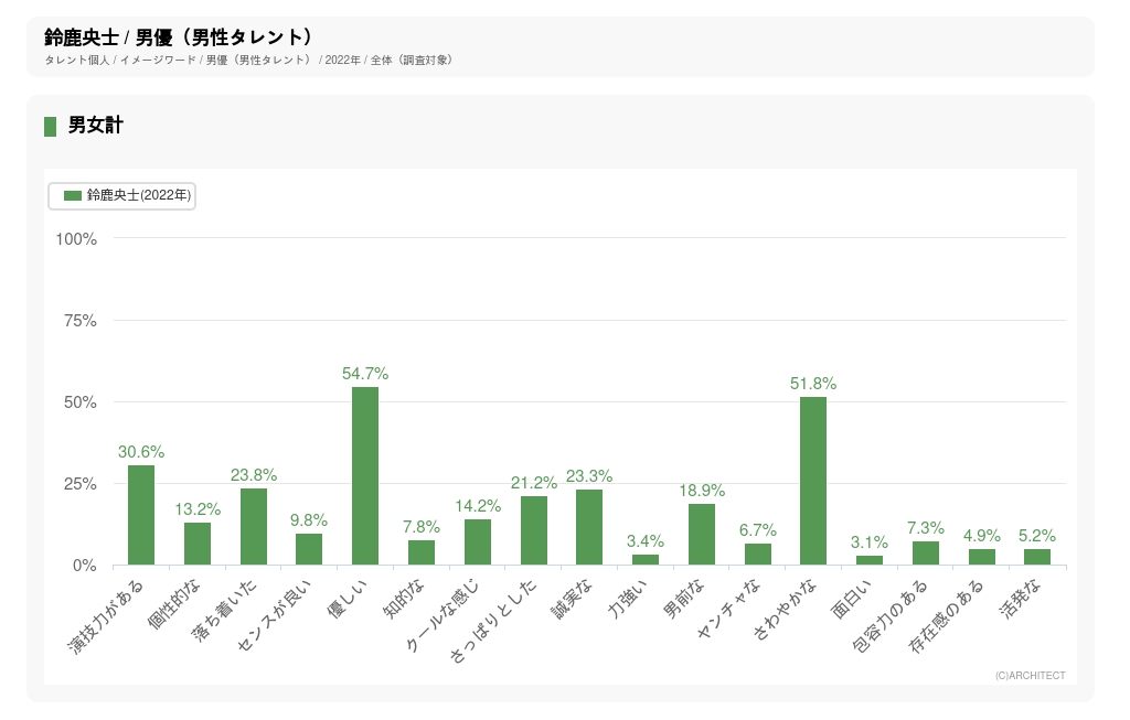 株式会社アーキテクトが2022年11月に実施したタレントパワーランキングの最新調査での10代から60代の男女の回答における認知度と誘引率(「もっと見たい、もっと知りたい」という関心を示す指標)の数値から算出した。
